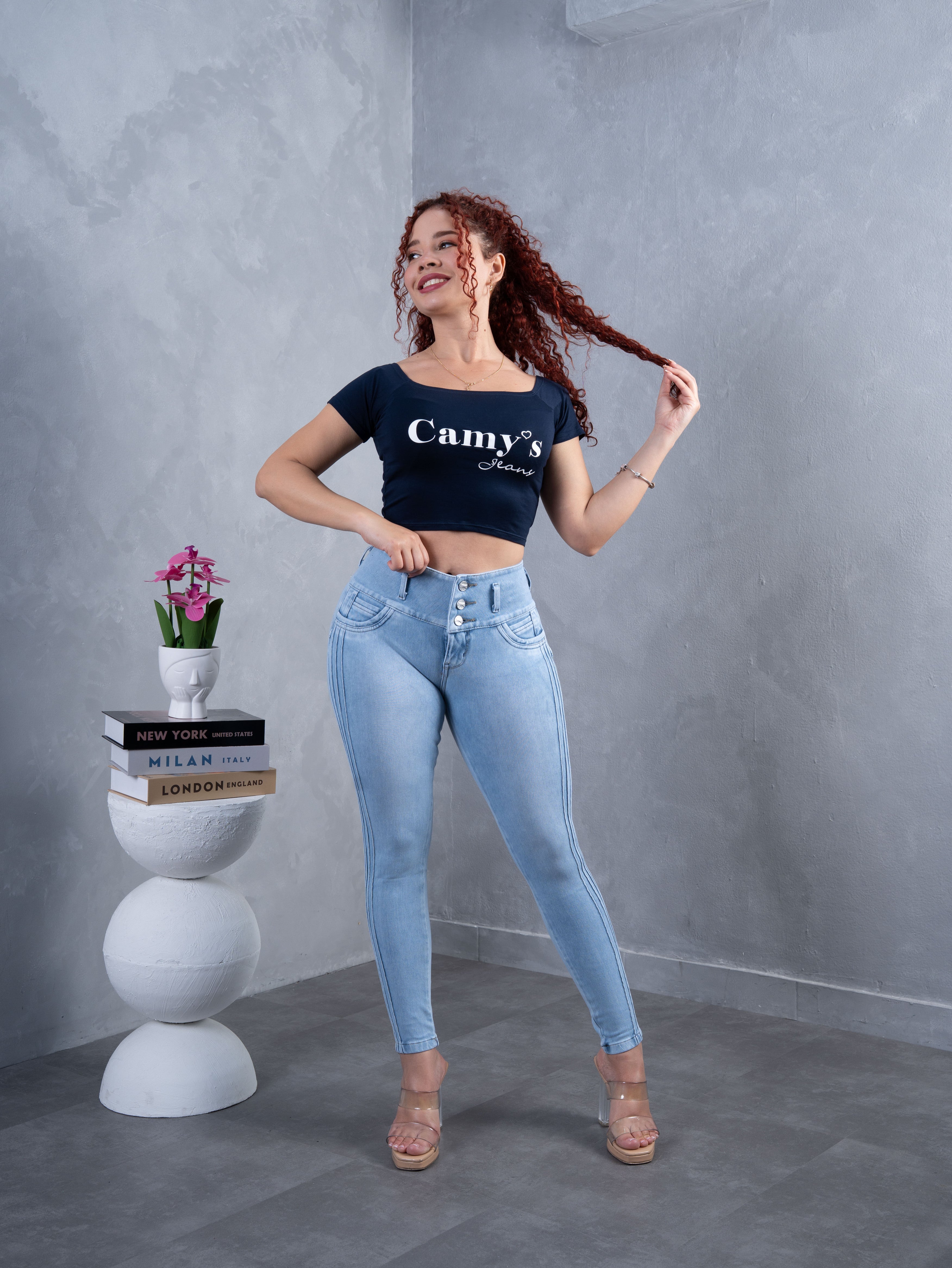 Pantalón hielo de 3 botones, con tres líneas al costado, hecho con material denim strech en la parte delantera y con french terry en la parte posterior, tiene corte corazón con tres pinzas que hacen lucir tu figura resaltando esas curvas.